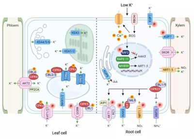 近日中國農(nóng)業(yè)大學武維華院士團隊題為"Potassium and phosphorus transport and signaling in plants"的綜述論文。該論文以擬南芥和水稻為例,系統(tǒng)歸納了植物、作物吸收、運輸鉀和磷的分子調(diào)控機制,以及植物/作物感受和應答低鉀、低磷逆境脅迫的信號轉(zhuǎn)導機制。此外,論文還討論了氮、磷、鉀養(yǎng)分之間的互作關(guān)系,及其協(xié)同吸收、運輸?shù)姆肿訖C理。