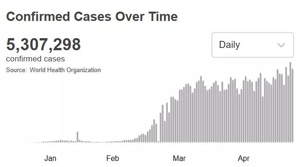 根據(jù)世衛(wèi)組織新實(shí)時(shí)統(tǒng)計(jì)數(shù)據(jù),截至北京時(shí)間5月26日0時(shí)42分,全球累計(jì)新冠肺炎確診病例5307298例,死亡病例342070例。
