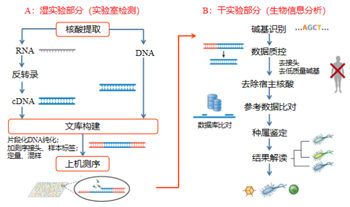 醫(yī)學(xué)檢驗(yàn)中采集病原微生物用于mNGS的樣本樣本類(lèi)型主要有靜脈血、腦脊液、肺泡灌洗液、痰液、胸水和腹水、咽部分泌物、局灶穿刺物、組織等多種類(lèi)型。mNGS的檢測(cè)流程可以大致分為5個(gè)步驟:核酸提取、文庫(kù)構(gòu)建、上機(jī)測(cè)序、生信分析與報(bào)告解讀。對(duì)病原微生物進(jìn)行測(cè)序前處理過(guò)程中關(guān)鍵的一步就是核酸提取,因?yàn)椴≡⑸锖怂崽崛⌒Ч暮脡模瑫?huì)直接影響到后續(xù)測(cè)序的成敗。
