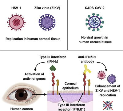 美國《細胞報告》雜志近期發表的一項研究表明,人類眼角膜對寨卡病毒和單純皰疹病毒1型易感,但似乎對新冠病毒有抵抗力。在此項研究中,專家們使用了25份角膜組織進行實驗,其中既包括人類角膜組織,也有實驗鼠供體的角膜組織,并將它們暴露于三種不同的病毒中,分別是:ZIKV、HSV-1和新冠病毒,結果發現新冠病毒沒有在角膜中繁殖。至于人角膜和結膜如何能夠抵抗新冠病毒,該研究團隊還不能完全確定。