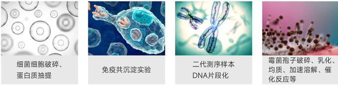 細菌細胞破碎、蛋白質抽提、免疫共沉淀實驗、二代測序樣本、霉菌孢子破碎/乳化、DNA片段化、均質/加速溶解/催化反應等