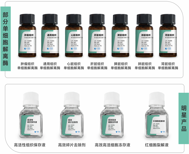 上海凈信推出了一系列針對不同組織的特異性單細胞解離酶,專為高質(zhì)量單細胞懸液制備而設計。產(chǎn)品采用了高純度、多元化酶配方,可快速、溫和解離組織樣本,最大限度保持細胞活性和完整性,適用于各類原代細胞提取、培養(yǎng)、流式分析、類器官、腫瘤組織解離及單細胞測序等研究。